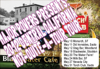Now that I have your attention, I'm very proud to announce our 2012 Central California Not-Quite-A-Tour Tour! Come send us off "on the road" on May 10 at Monarch in SF for a night of Adventure Piano (featuring the musical stylings of the John Brothers Piano Company, Sit Kitty Sit and Dominique Leone). The following evening, May 11, come catch a set at historic Old Ironsides in Sacramento. The very next night (as to give these shows a tour-like appearance) we're rolling into Woodland for a night of beer-soaked Woodlandyness at The Stag Bar with The MonoMyth Inception.